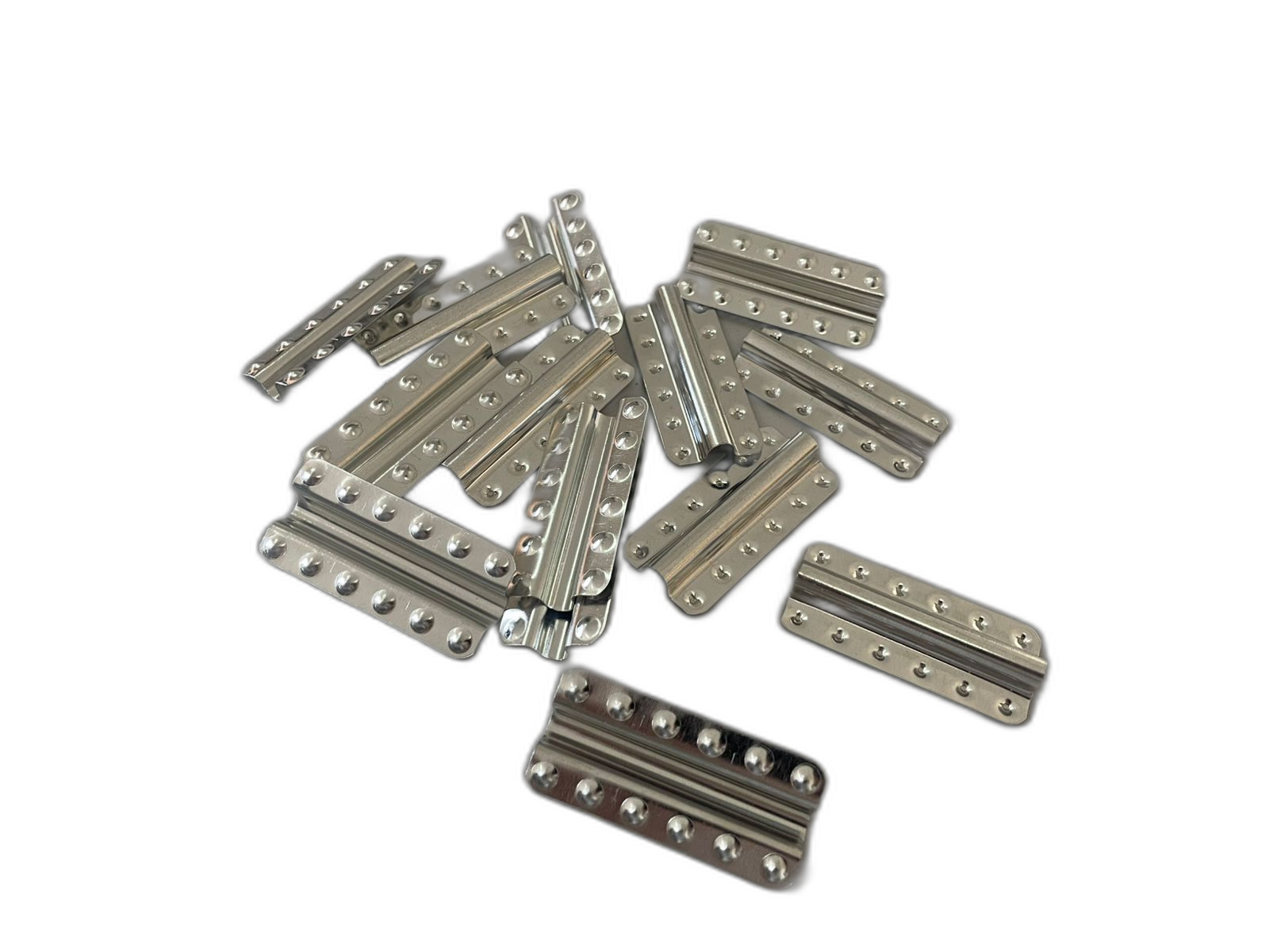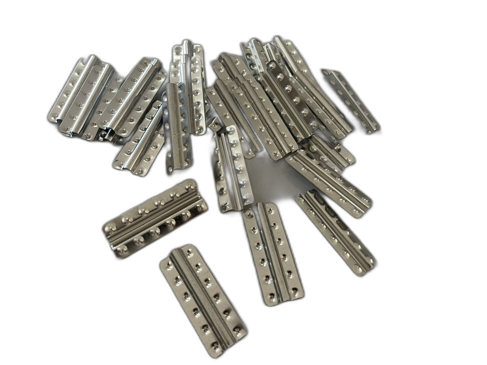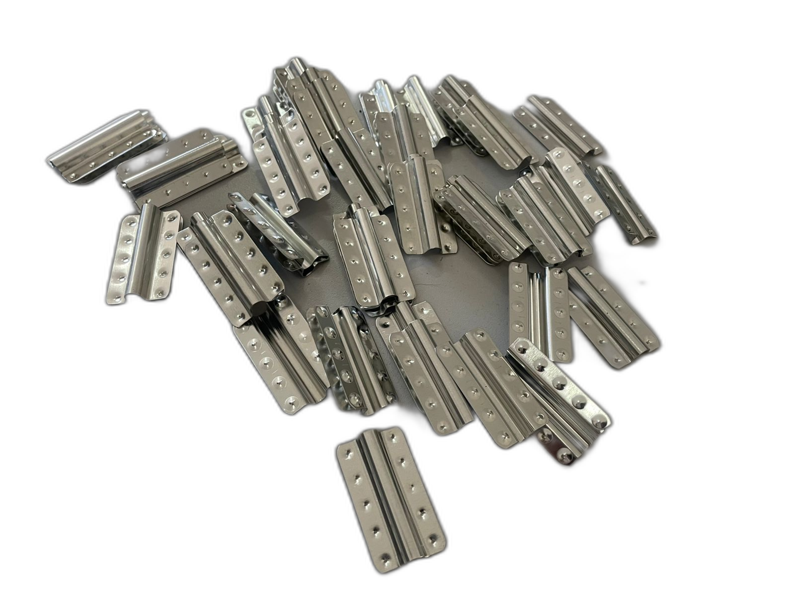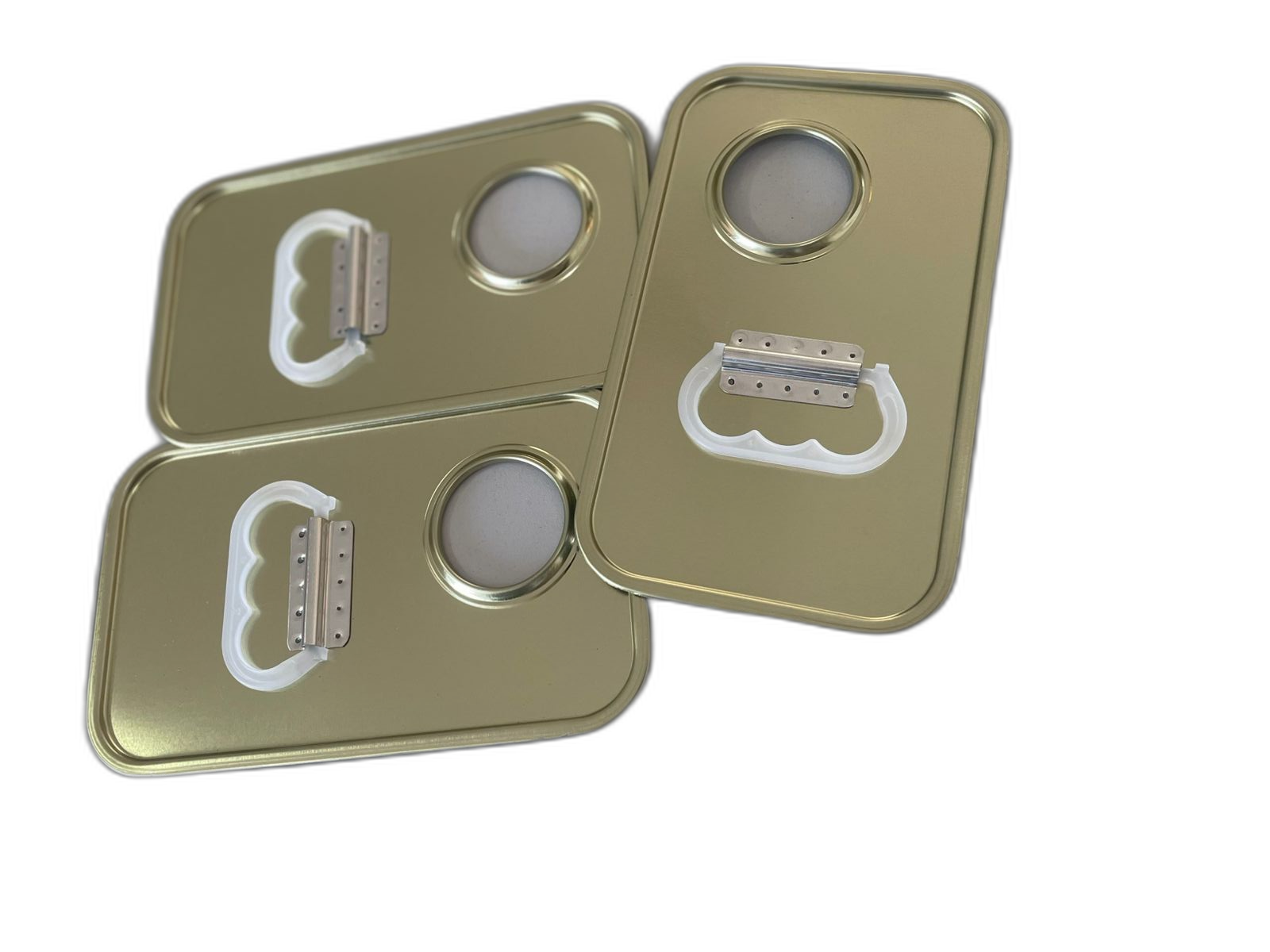 Peça metálica projetada para fixação por soldagem, com a função de alojar alças plásticas em tampas de latas retangulares de 18 litros. Utilizadas no envase de tintas, vernizes e produtos similares ou em baldes metálicos de 20 litros destinados ao acondicionamento de óleos e derivados, assegurando resistência mecânica e praticidade no manuseio.